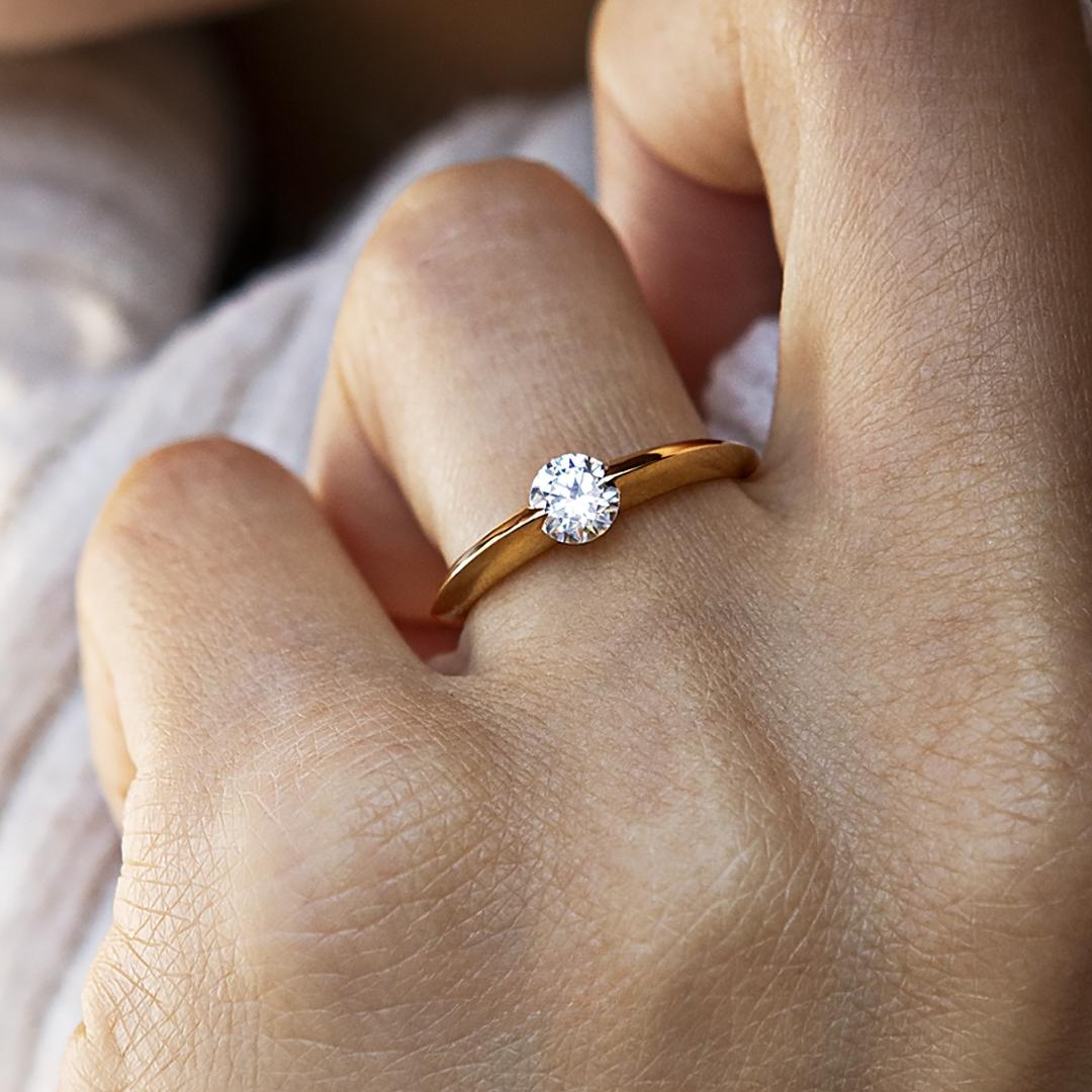 Nowoczesny pierścionek zaręczynowy z centralnym kamieniem w odsłoniętej, niskiej oprawie – lekkość formy i wyrazistość w jednym. Projekt który mówi: ”jesteś wyjątkowa”.