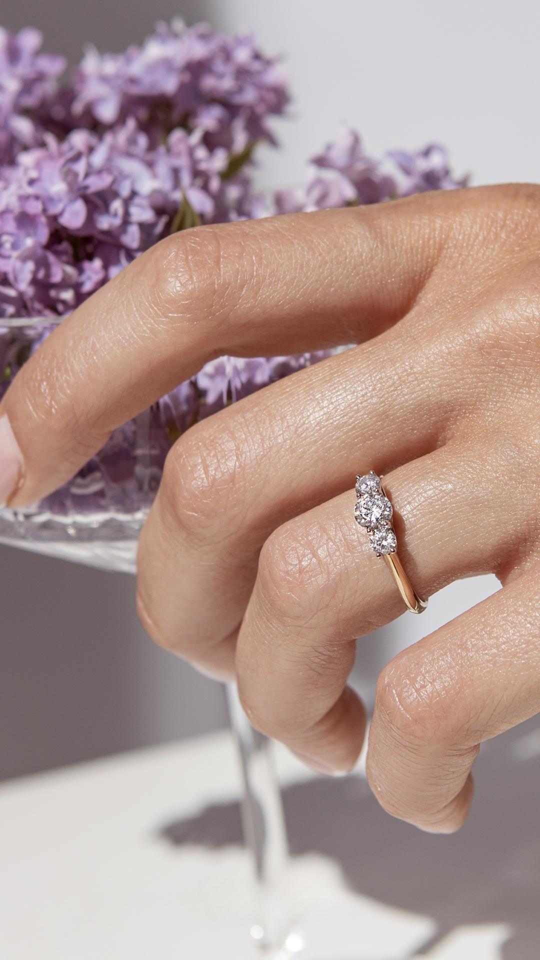 Pierścionek zaręczynowy z trzema kamieniami, zaokrąglone łuki i smukła linia szyny, która symbolizuje równowagę, miłość i trwałość na lata.