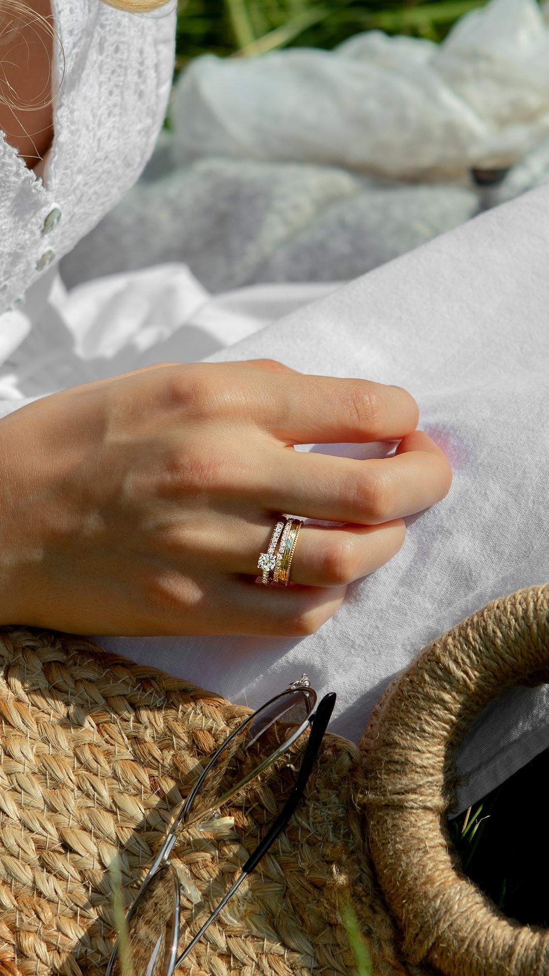 Dzięki innowacyjnemu podejściu do projektowania szyny pierścionek został stworzony z myślą o zachowaniu elegancji i wytrzymałości. Dzięki precyzyjnemu wykończeniu boków, szyna działa niczym lustro, subtelnie podkreślając smukłość dłoni i jednocześnie dodając wyrazistości osadzonemu kamieniowi.
